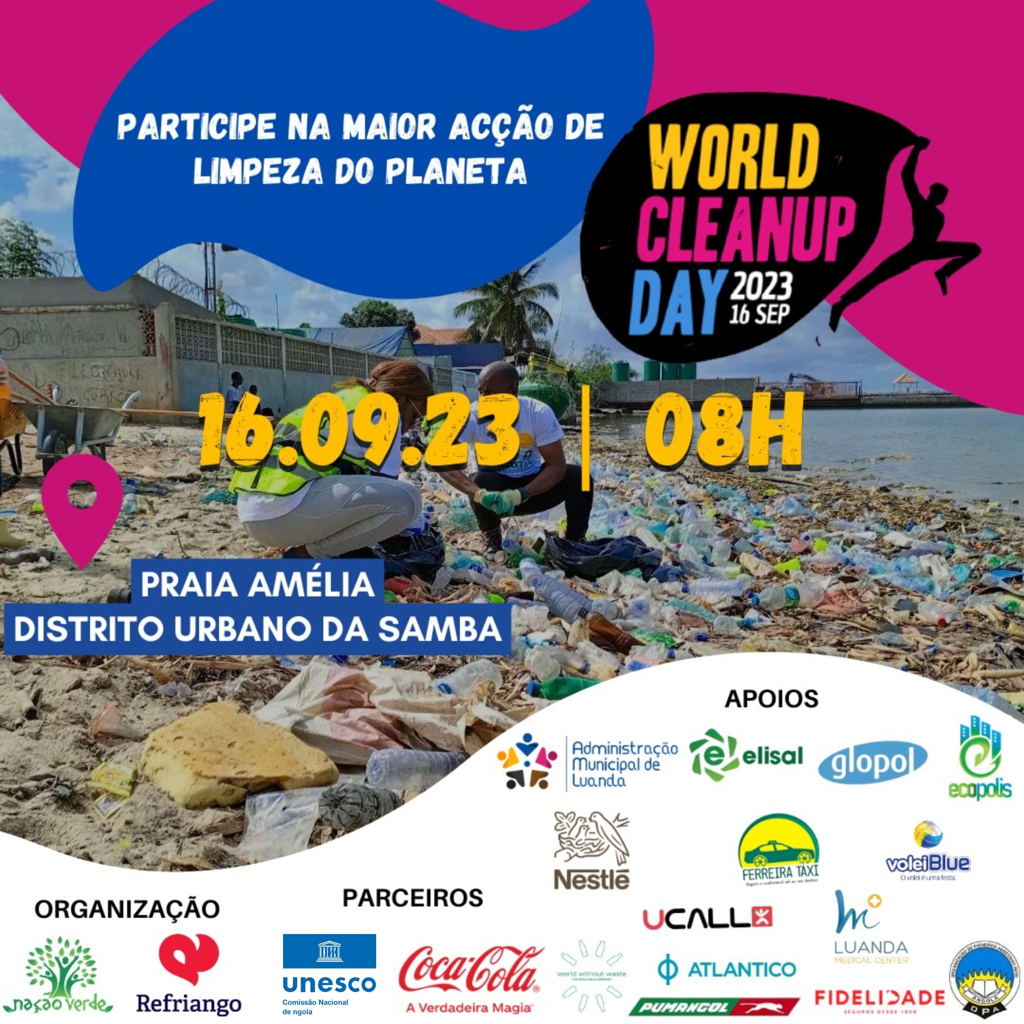 Setembro 16, 2023 World Cleanup Day Praia Amelia Samba, Luanda Faça parte da maior acção de limpeza do Planeta! $10